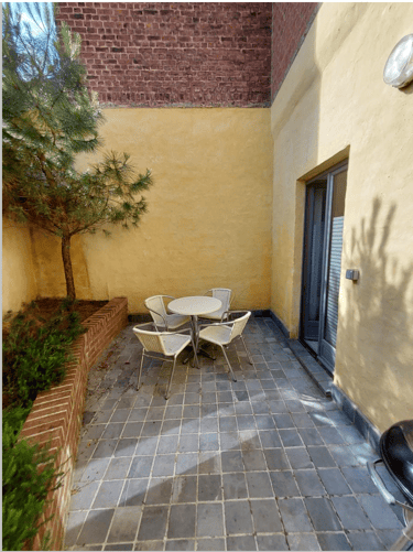 Bureau aménagé, mobilier neuf, bureau, 2 chaises, cour intérieure avec 1 table et 3 chaises, interphone, internet