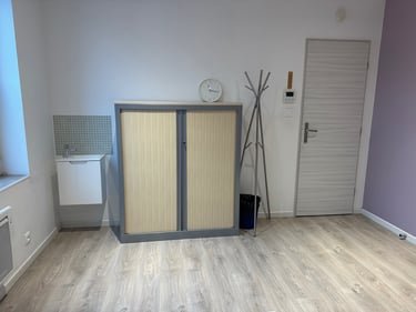 1 bureau, table 1/2 lune, 2 chaises, 1 armoire à clef, lave-mains, interphone, internet